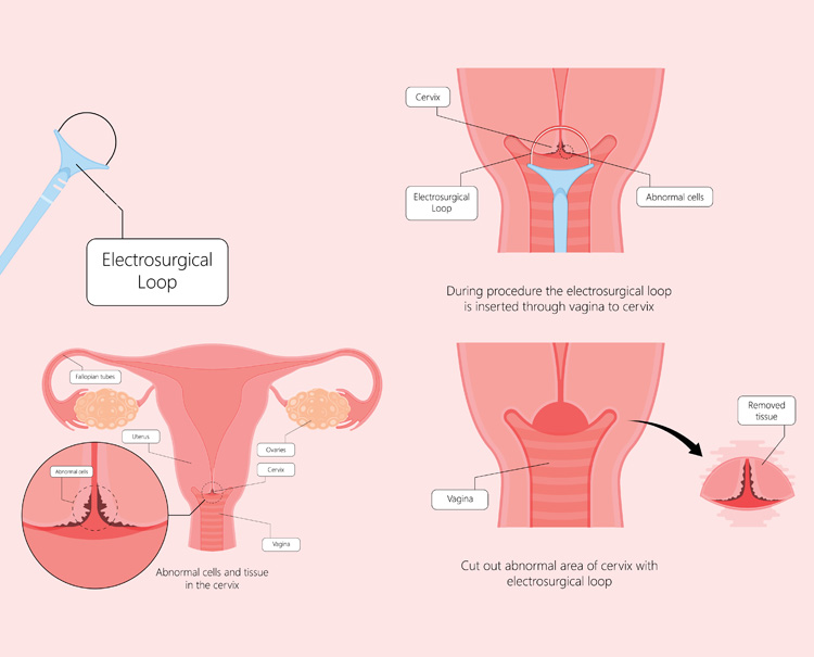 A thin electrified wire cuts out the abnormal cervical tissue (cone biopsy) , which can be done in the outpatient setting while conscious, or have it done under sedation in the day surgery.